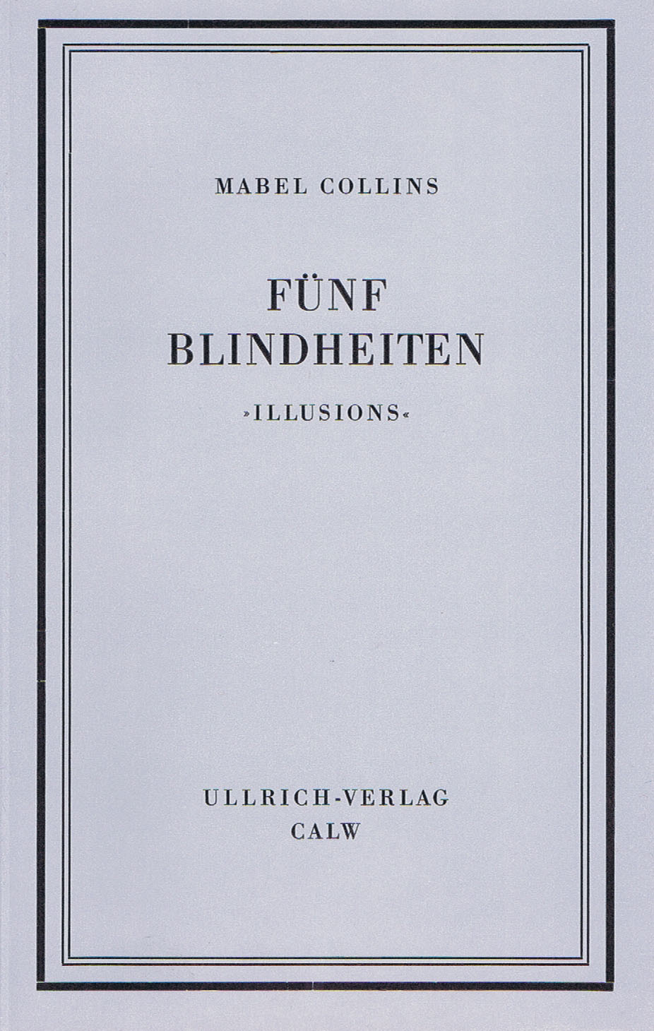 Mabel Collins: Fünf BlindheitenVorgänge vor allem bei der Wiedereinkörperung, dargestellt in erzählten Beispielen, die sich an deutende Abhandlungen anschließen.