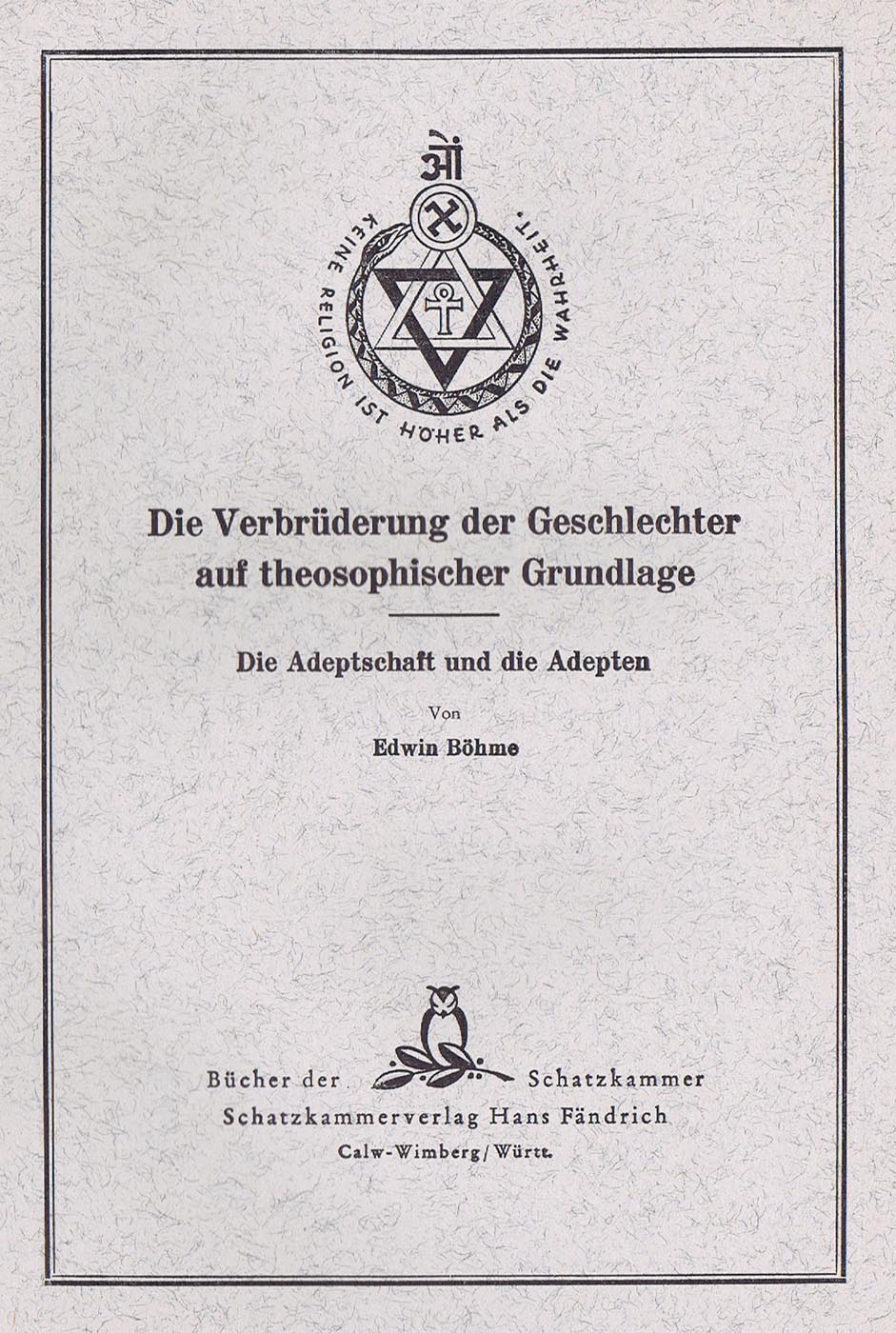 Edwin Böhme: Die Verbrüderung der Geschlechter auf theosophischer GrundlageIn dieser kleinen Schrift wird das Verhältnis von Mann und Frau aus okkulter Sicht geschildert. 15 Seiten.
