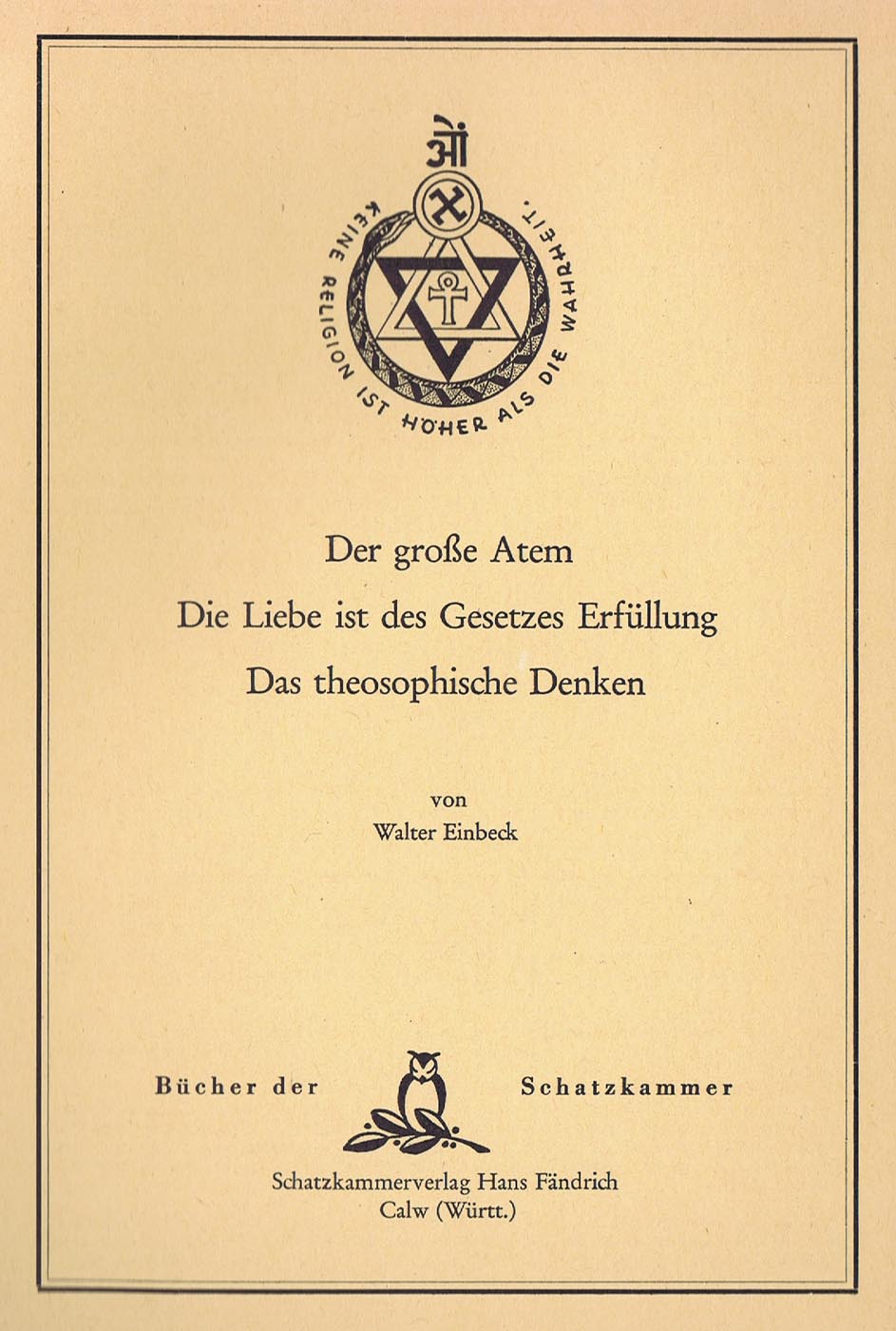 Walter Einbeck: Der große Atem – Die Liebe ist des Gesetzes Erfüllung – Das theosophische DenkenDiese drei kurzen Abhandlungen wirken eindringlich und förderlich auf die Entfaltung des geistigen und seelischen Lebens im Menschen. 15 Seiten.